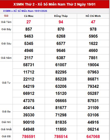 Dựa trên thống kê giải đặc biệt và phân tích 2 số cuối của toàn bộ các giải, kết quả xổ số Miền Nam ngày 19/1/2026 cho thấy mỗi đài có xu hướng vận động khác nhau, trong đó nổi bật là hiện tượng lặp đuôi và phân bổ chẵn – lẻ khá rõ ràng.